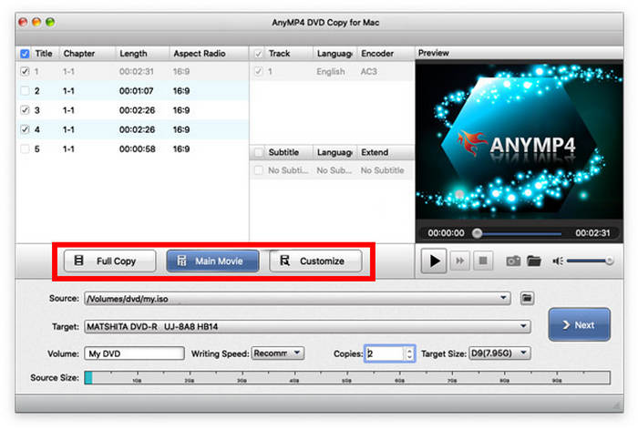 Step 3.Once the software has read the content of the DVD, choose the copying mode you want to use. You can select between Full Copy, Main Movie, or the Customize option to modify the parts that will be copied yourself.