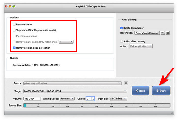 Step 4.After selecting the copy mode, you can now adjust the playback menu to be customized. These include Remove Menu, Skip Menu, and Remove Region Code, as well as several options to customize the quality of the movie that will be converted. After editing these options, click Start to begin the DVD ripping process.