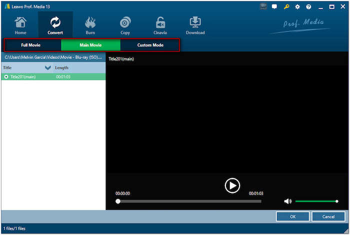 Välj ett laddningsläge för att importera de titlar du vill rippa: Helfilm, Huvudfilm eller Anpassat läge. Välj Helläge för att importera alla tillgängliga titlar, Huvudfilm för att bara lägga till huvudfilmen eller Anpassat läge för att välja en specifik titel för konvertering.