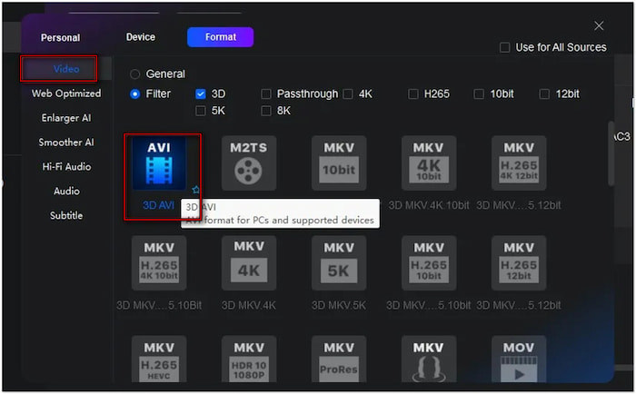 Adım 2.Profil kitaplığı açılır menüsüne tıklayın ve Diğer Profili Seç seçeneğini seçin. 3D Blu-ray kopyalıyorsanız, 3D ön ayarını seçin. 3D kutusunu işaretleyin ve seçin 3D AVİ format, 3D modu ve kalite.