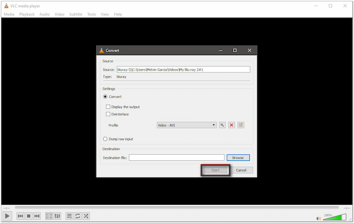 Adım 4.Hedef klasörü ayarlamak için Hedef Dosya'nın yanındaki Gözat'a tıklayın. Dosya uzantısının .avi olduğundan emin olun ve bir dosya adı seçin. Ardından, tıklayın Başlangıç Blu-ray içeriğini tercih ettiğiniz formata dönüştürmek için.