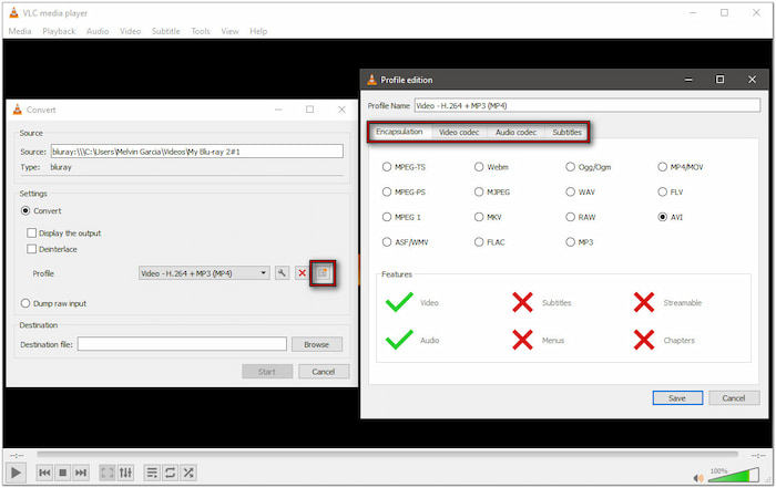 VLC medya oynatıcı Birçok kişi tarafından Blu-ray diskleri gibi fiziksel medyalar da dahil olmak üzere medya oynatma için bilinir. Medya oynatmanın yanı sıra, VLC Media Player ek işlevlerle birlikte gelir. Yapılandırılabilir profil ayarlarıyla Blu-ray'i AVI formatına dönüştürmenize olanak tanır. Ancak, bölge kilitli ve kopya korumalı diskleri işleyemediği için ekstra kurulum gerektirir.