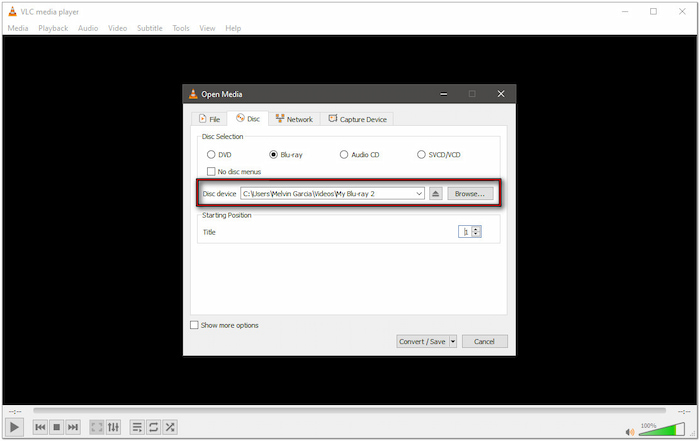 Adım 2. Açık Medya iletişim penceresinde Disk sekmesine geçin ve Bluray seçeneği. Blu-ray kaynağını içe aktarmak için Disk Aygıtı alanının yanındaki Gözat'a tıklayın. Dönüştürme işlemine devam etmek için Dönüştür/Kaydet düğmesine tıklayın.