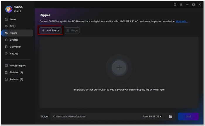 Aşama 1.Blu-ray diskinizi alın ve Blu-ray optik disk sürücüsüne yerleştirin. DVDFab Blu-ray Ripper'ı çalıştırın, Ripper'ı seçin ve tıklayın + Kaynak Ekle Diski yüklemek için. Yazılım daha sonra Blu-ray kaynağını algılayacak ve yükleyecektir.