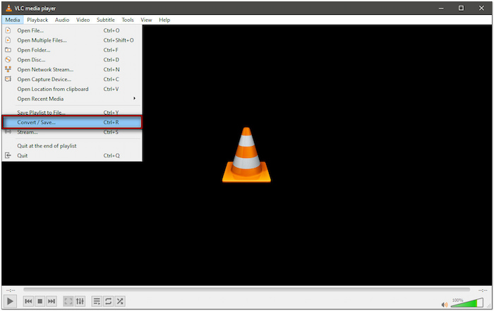 Aşama 1.Blu-ray diskinizi alın ve bağlı harici Blu-ray sürücüsüne yerleştirin. VLC Media Player'ı açın, sol üst bölüme geçin ve Media'ya tıklayın. Dönüştür/Kaydet Açık Medya iletişim penceresini açma seçeneği.