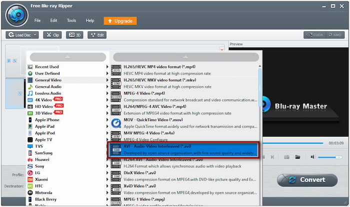 Blu-ray Master Free Blu-ray Ripper, ücretsiz Blu-ray'den AVI'ye dönüştürme için en iyi araçtır. Bu yazılım çoğu kopya korumasını ve hatta herhangi bir bölgeden Blu-ray'leri bile idare edebilir. Ek olarak, AVI profili tercihinize uygun birden fazla ön ayar ve çözünürlükle birlikte gelir.