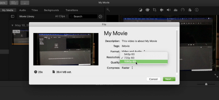 Βήμα 3.Θα εμφανιστεί ένα παράθυρο διαλόγου που περιέχει διαφορετικές ρυθμίσεις εξαγωγής. Μπορείτε να τροποποιήσετε την παράμετρο εξόδου της ταινίας σας σε αυτό το παράθυρο. Μόλις ορίσετε τις προτιμήσεις σας, επιλέξτε Επόμενο προς την εξαγωγή iMovie σε MP4.