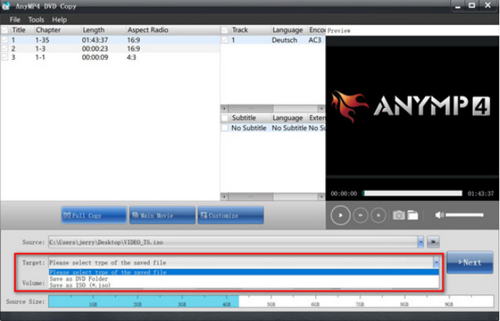 2. lépés. Helyezzen be egy DVD-lemezt a számítógépbe. A szoftver automatikusan betölti a DVD-lemez adatait. Ezután lépjen a következőre: Forrás legördülő menüből válassza a DVD lemezként, mappaként vagy ISO formátumban történő mentéséhez szükséges opciókat.