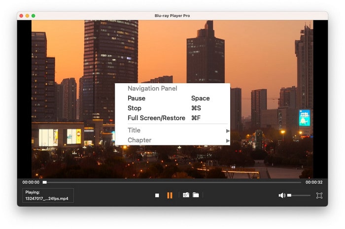 步骤4。 播放控制: 点击三角形按钮(或按下空格键)即可开始或暂停播放。三角形播放按钮旁边还有两个相邻的按钮,点击它们可以快进或快退蓝光光盘。